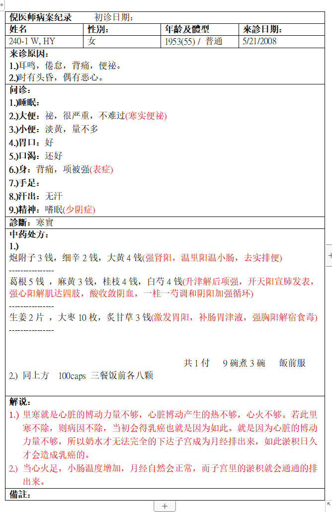 倪医师病案纪录 初诊日期:姓名性別:年齡及體型來診日期:240-1 W, HY 女1953(55) / 普通5/21/2008来诊原因:1.)耳鸣,倦怠,背痛,便祕。2.)时有头昏,偶