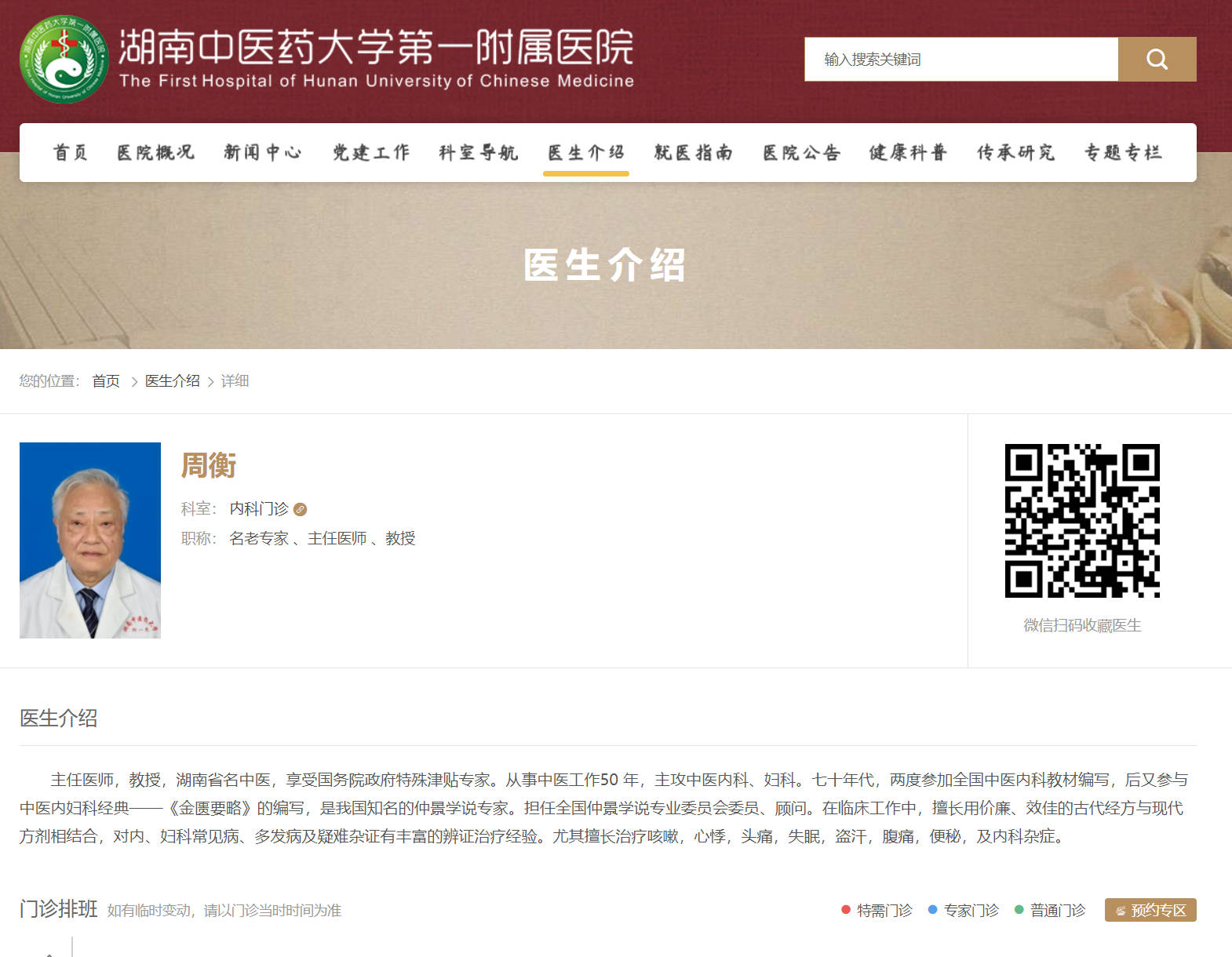 湖南中医药大学第一附属医院医院地址:湖南长沙韶山中路95号医院电话:24小时急救电话: 0731-85600120 85600700周衡职称: 名老专家 、主任医师 、教授主任医师,教授,湖南省名中医,享受国务院政府特殊津贴专家。从事中医工作50 年,主攻中医内科、妇科。七十年代,两度参加全国中医内