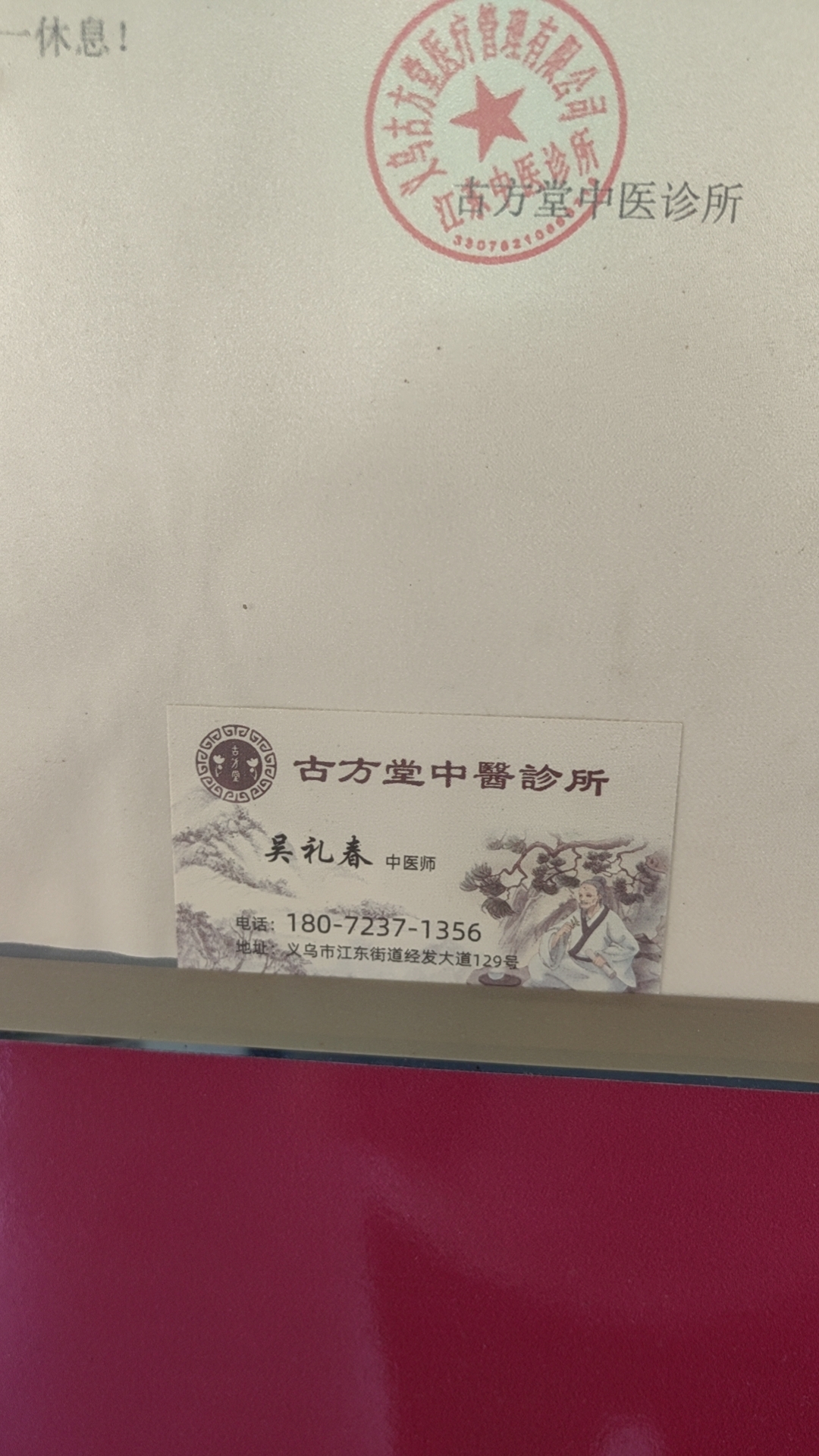【患者介绍】古方堂中醫診所吴礼春 中医师电话:180-7237-1356地址:义乌市江东街道经发大道129号营业时间是早上9:30到17:30,周一休息治病故事①女患者的症状是生孩子后全身发痒,痒到抓的出血了,去看了医生,医生说不用开药,去运动一下,流点汗就可以了,治病的目的不吃药