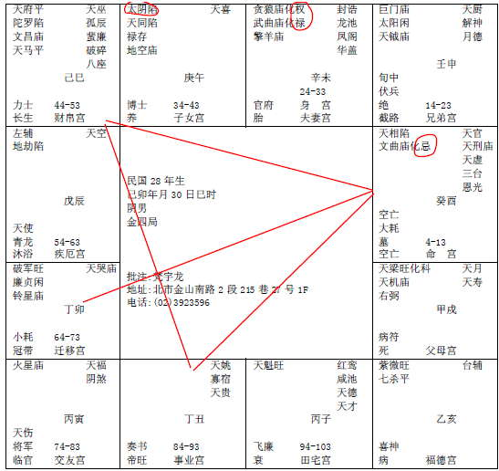 民国28,阴男,金四局,紫微在亥,命宫在酉。