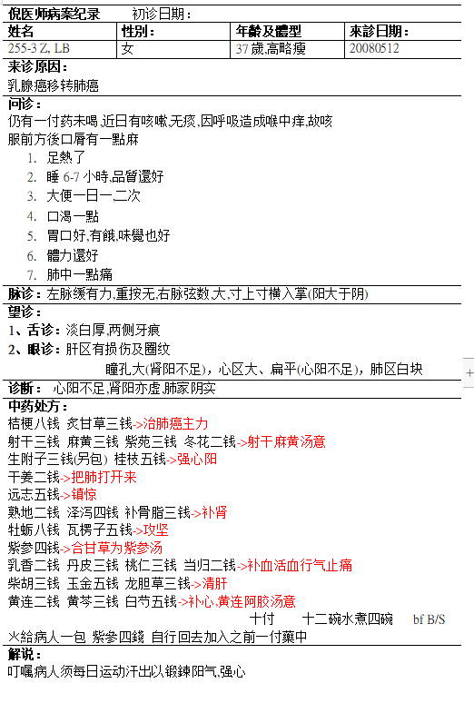 倪医师病案纪录 初诊日期:姓名性別:年齡及體型來診日期:255-3 Z, LB女37歲,高略瘦20080512来诊原因:乳腺癌移转肺癌问诊:仍有一付药未喝,近日有咳嗽,无痰,因呼吸造成喉中痒,故咳服前方後口脣有一點麻1. 足熱了2.